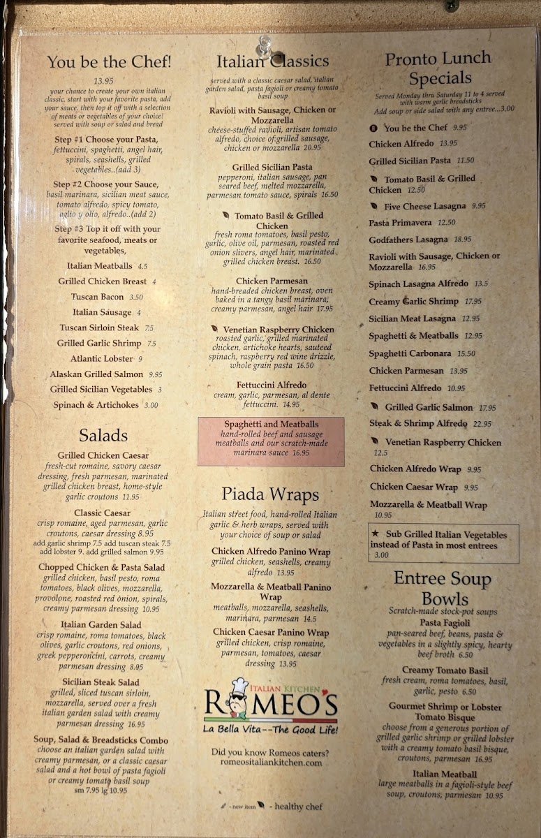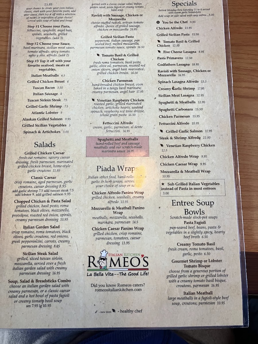 crisp romaine, roma tomatoes, blackolives, garlic croutons, red onions,greek pepperoncini, carrots, creamyparmesan dressing